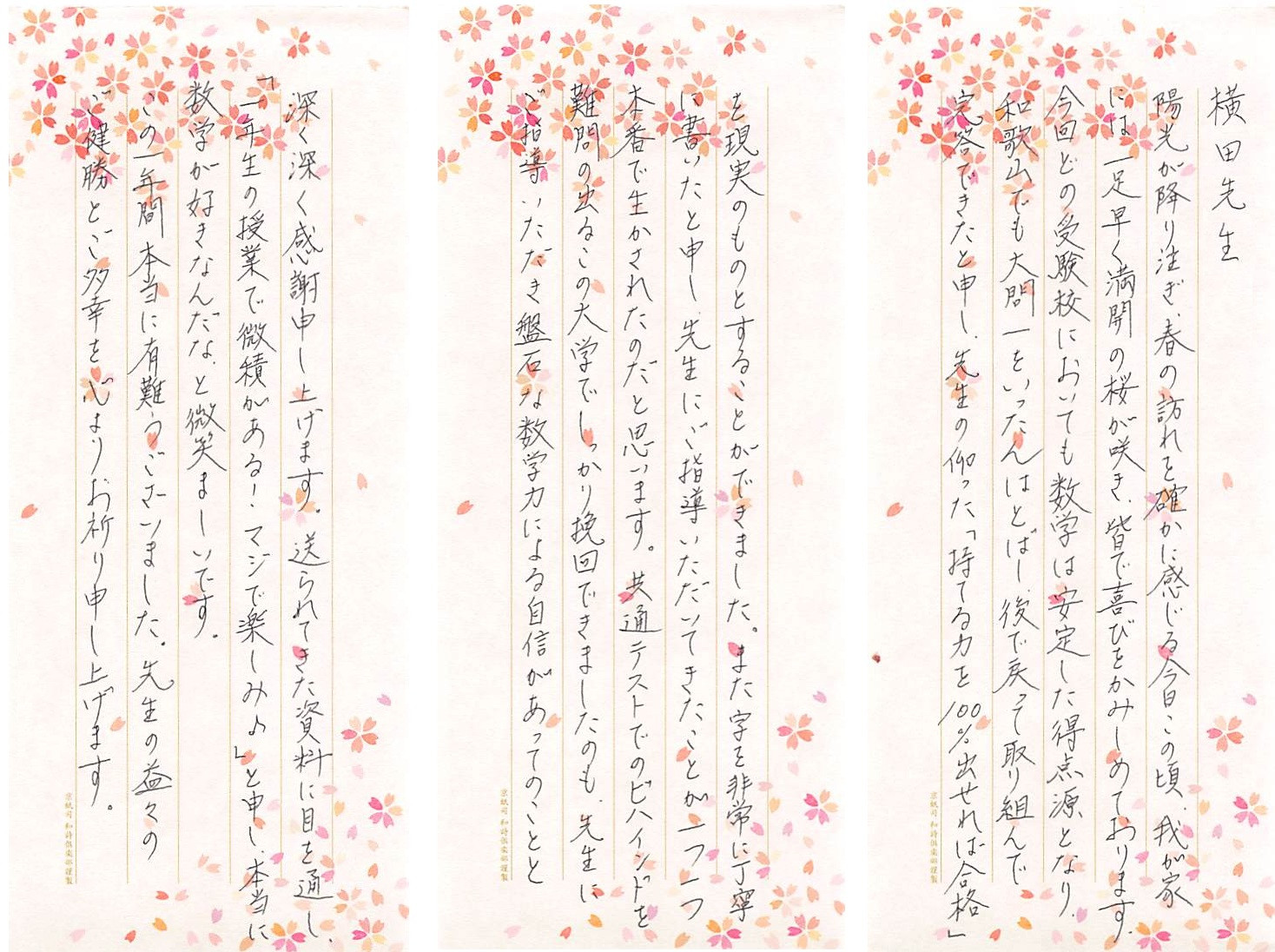 和歌山県立医科大学合格をされた生徒のお父様からと、福井大学医学部(後期試験)に合格をされた生徒さんからの”喜びの手紙”を、2通分掲載させていただきます